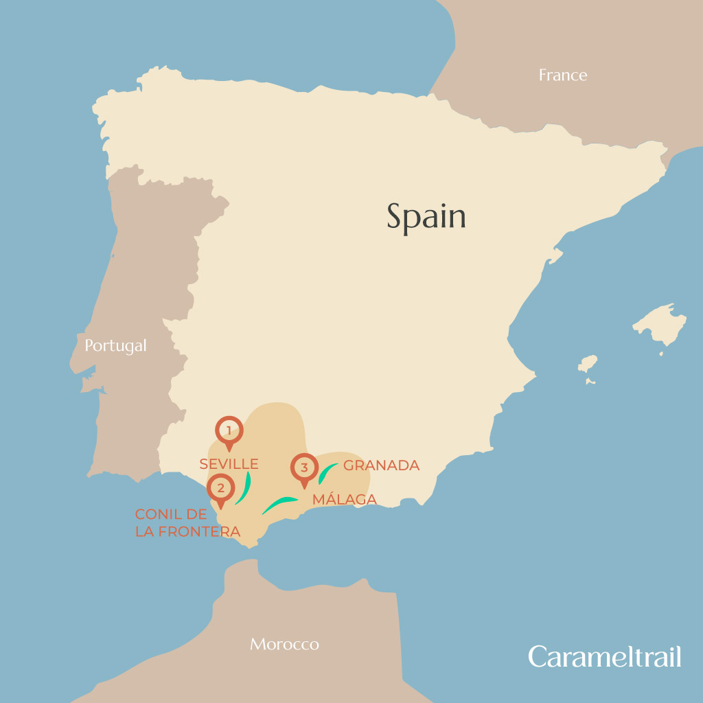 Today’s route takes you from Conil de la Frontera to Málaga, leaving the laid-back Atlantic coast behind as you head east along Andalusia’s southern edge.
